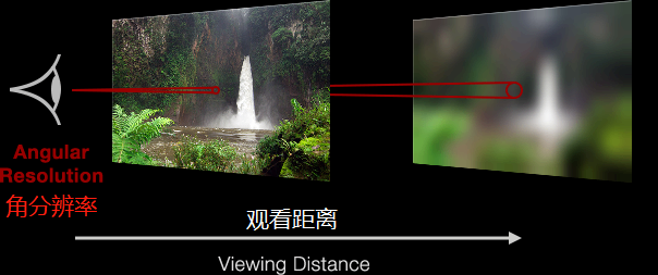 我们对细节的感知不仅取决于观看对象最小的特征,还取决于观察这些特征的距离。因此,我们通常用角分辨率(angular resolution)来描述人的视觉: