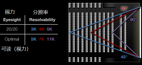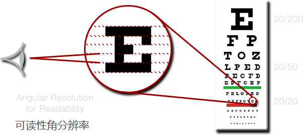 我们对细节的感知不仅取决于观看对象最小的特征,还取决于观察这些特征的距离。因此,我们通常用角分辨率(angular resolution)来描述人的视觉: